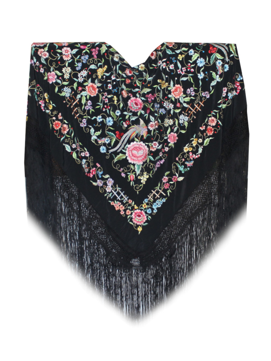 Nuestros bordados son ricos y coloridos, dominados como es tradicional por flores grandes y coloridas como rosas, peonías, claveles, y otras flores exóticas, pero también aves y otros animales, etc., especialmente en nuestros mantones más antiguos.
