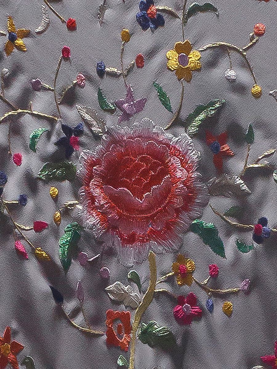 Nuestros bordados son ricos y coloridos, dominados como es tradicional por flores grandes y coloridas como rosas, peonías, claveles, y otras flores exóticas, pero también aves y otros animales, etc., especialmente en nuestros mantones más antiguos.