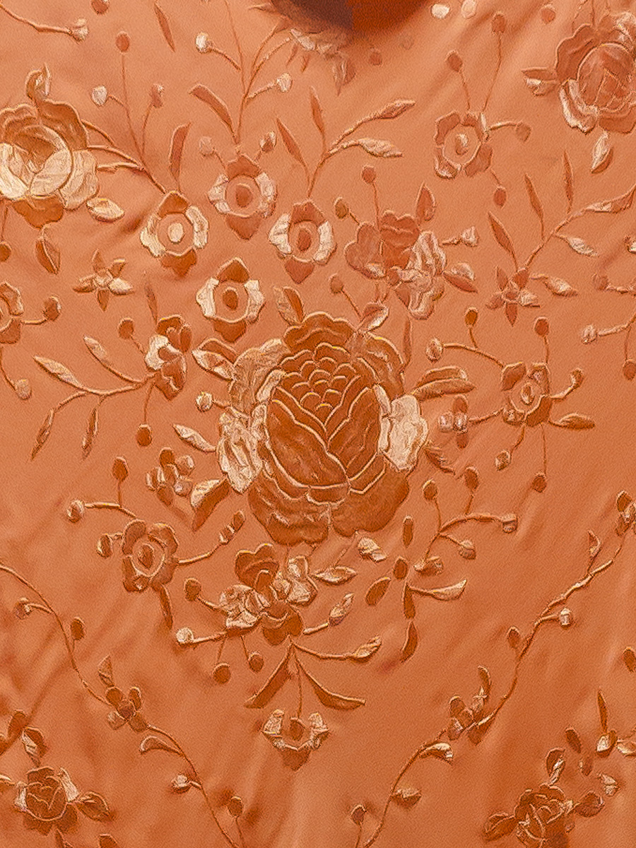 Nuestros bordados son ricos y coloridos, dominados como es tradicional por flores grandes y coloridas como rosas, peonías, claveles, y otras flores exóticas, pero también aves y otros animales, etc., especialmente en nuestros mantones más antiguos.