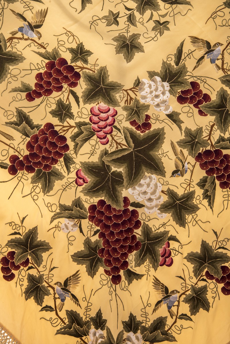 Nuestros bordados son ricos y coloridos, dominados como es tradicional por flores grandes y coloridas como rosas, peonías, claveles, y otras flores exóticas, pero también aves y otros animales, etc., especialmente en nuestros mantones más antiguos.