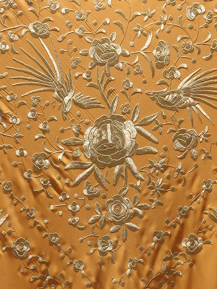 Nuestros bordados son ricos y coloridos, dominados como es tradicional por flores grandes y coloridas como rosas, peonías, claveles, y otras flores exóticas, pero también aves y otros animales, etc., especialmente en nuestros mantones más antiguos.