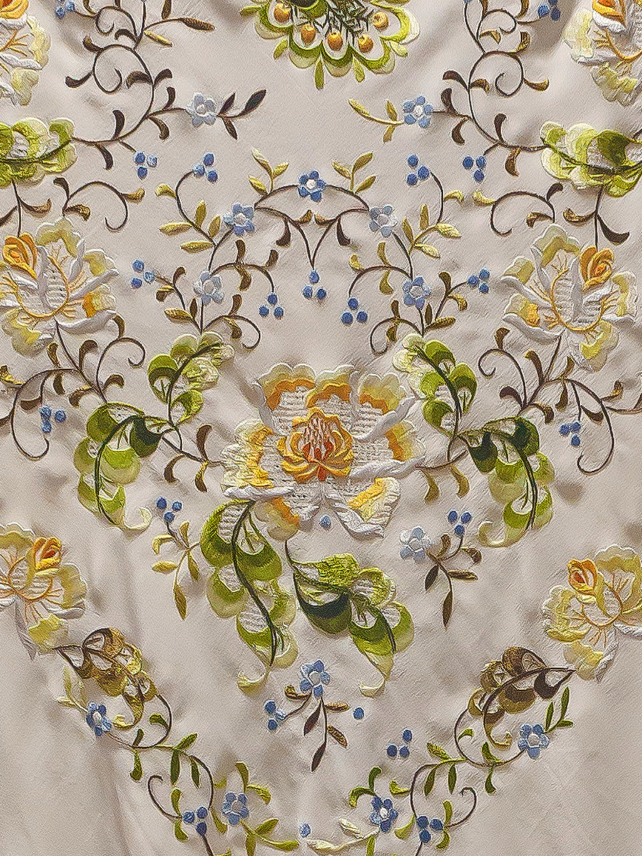 Nuestros bordados son ricos y coloridos, dominados como es tradicional por flores grandes y coloridas como rosas, peonías, claveles, y otras flores exóticas, pero también aves y otros animales, etc., especialmente en nuestros mantones más antiguos.
