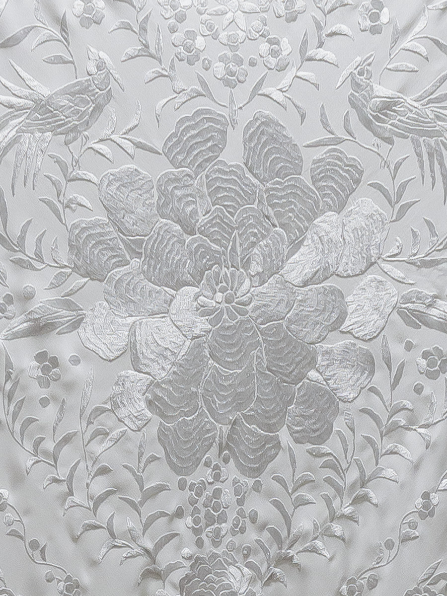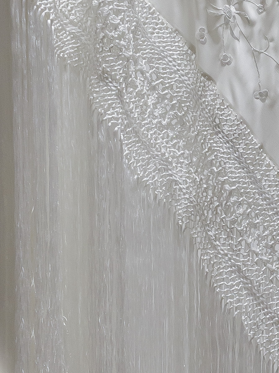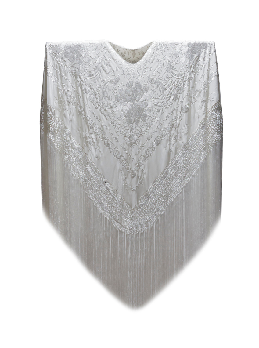 La mayoría de nuestros mantones de seda natural, un tejido suave, ligero y con un brillo natural, bordados y con flecos anudados a mano durante semanas o incluso meses como se hacía antes, por nuestros maestros artesanos de tercera generación.