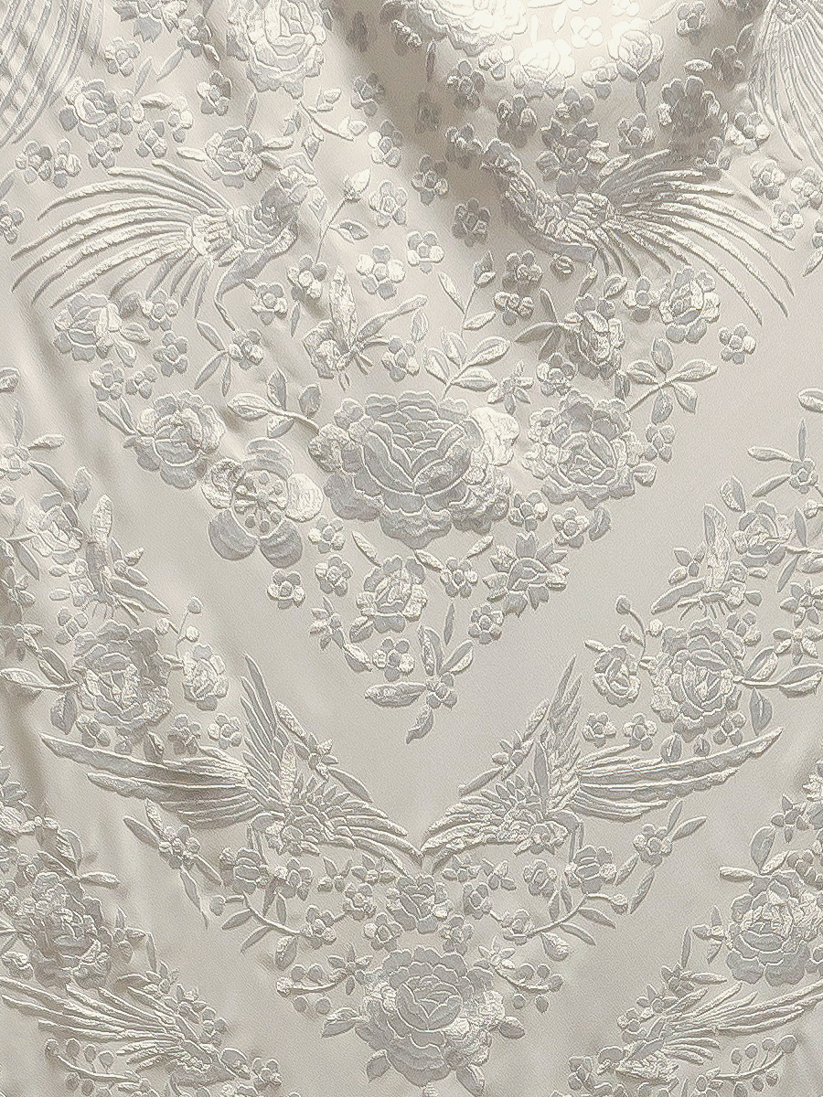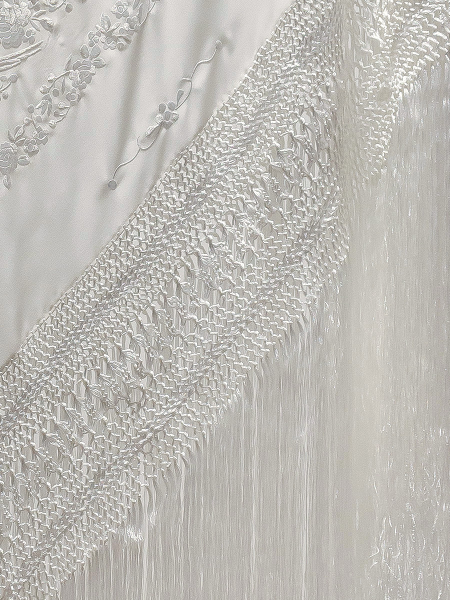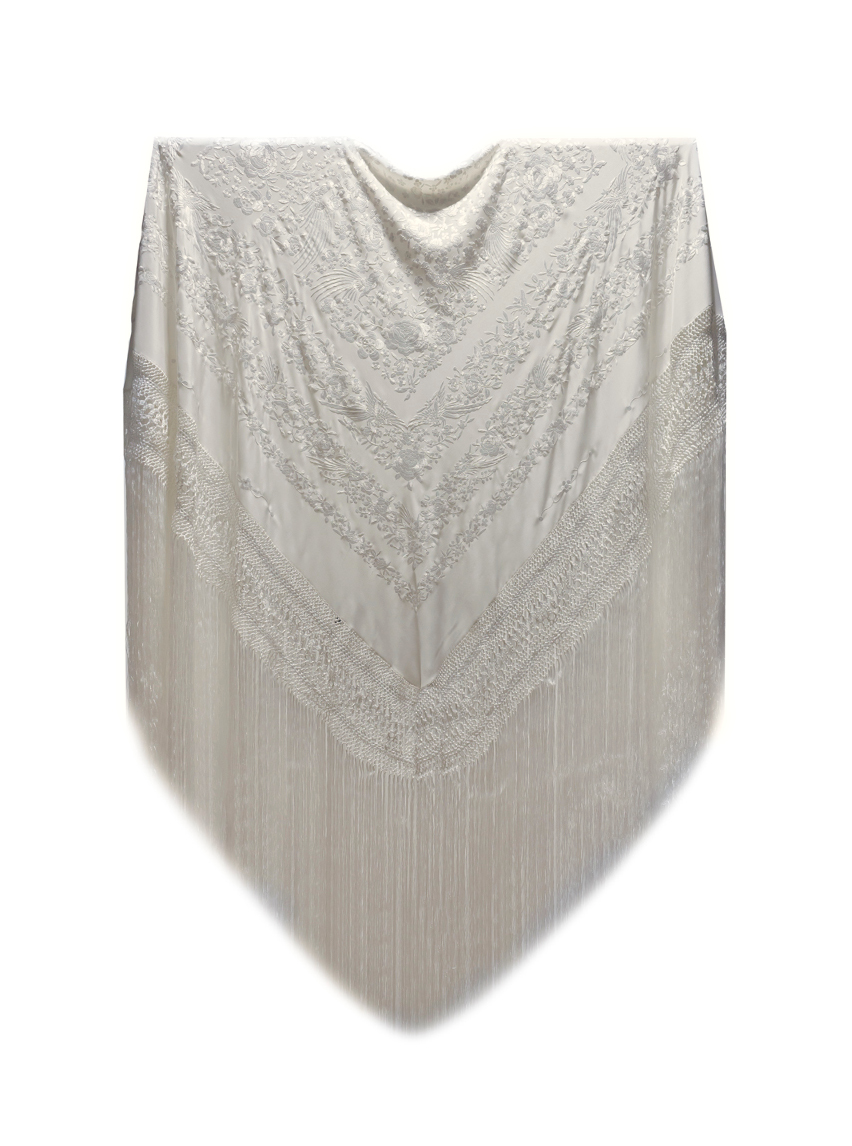 La mayoría de nuestros mantones de seda natural, un tejido suave, ligero y con un brillo natural, bordados y con flecos anudados a mano durante semanas o incluso meses como se hacía antes, por nuestros maestros artesanos de tercera generación.