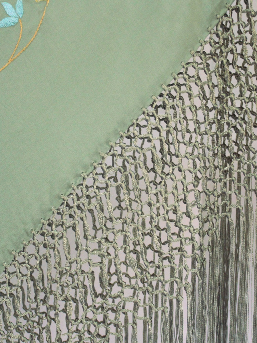 Mantón seda natural tamaño mediano bordado a mano con fleco anudado a mano.