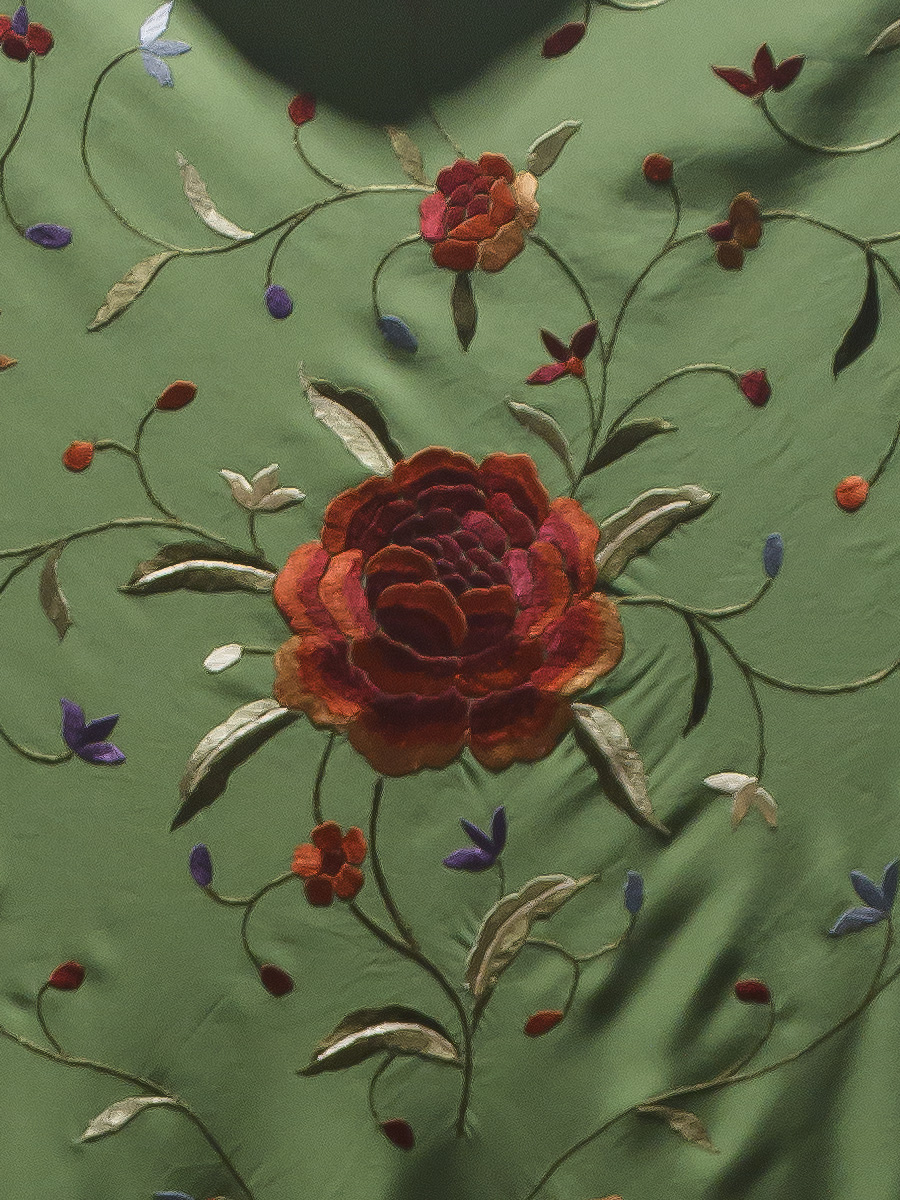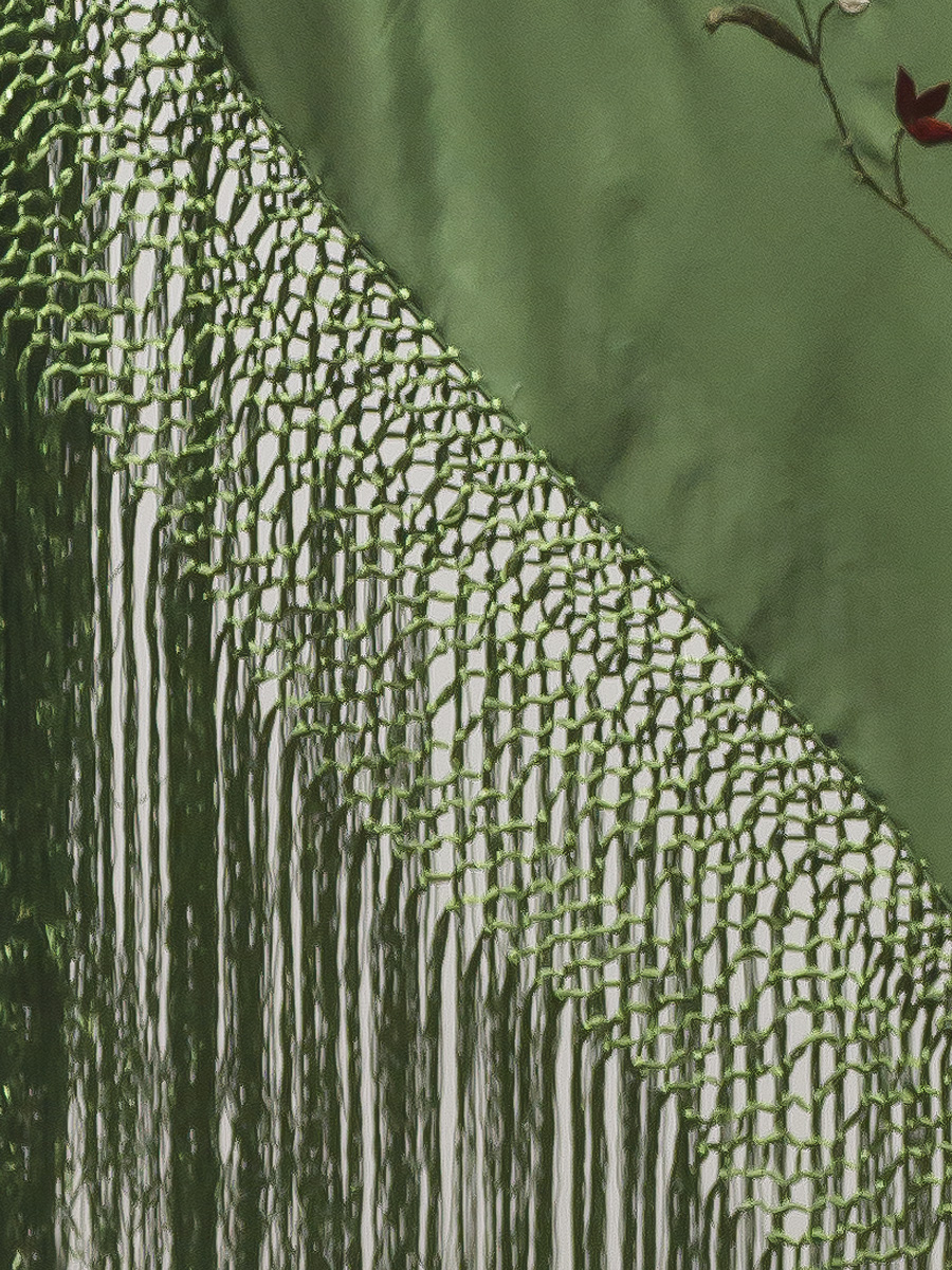 La mayoría de nuestros mantones de seda natural, un tejido suave, ligero y con un brillo natural, bordados y con flecos anudados a mano durante semanas o incluso meses como se hacía antes, por nuestros maestros artesanos de tercera generación.