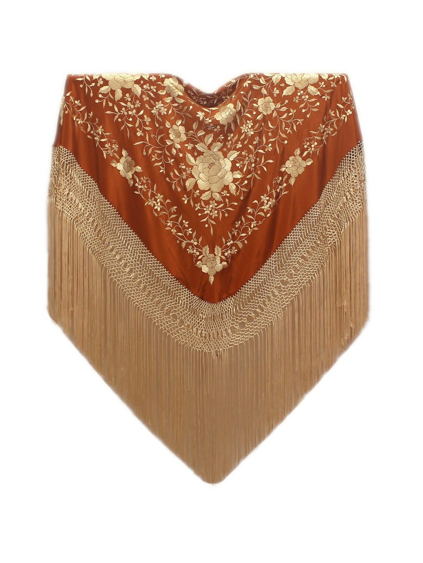 Mantón seda natural tamaño mediano bordado a mano con fleco anudado a mano.