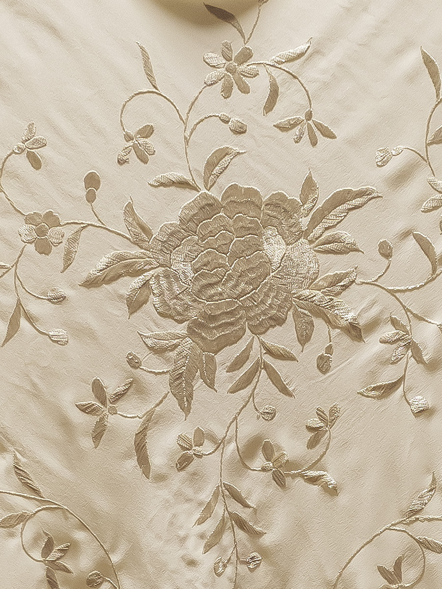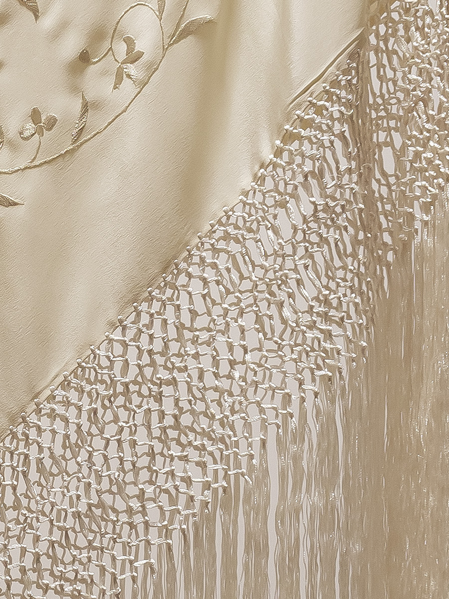 La mayoría de nuestros mantones de seda natural, un tejido suave, ligero y con un brillo natural, bordados y con flecos anudados a mano durante semanas o incluso meses como se hacía antes, por nuestros maestros artesanos de tercera generación.
