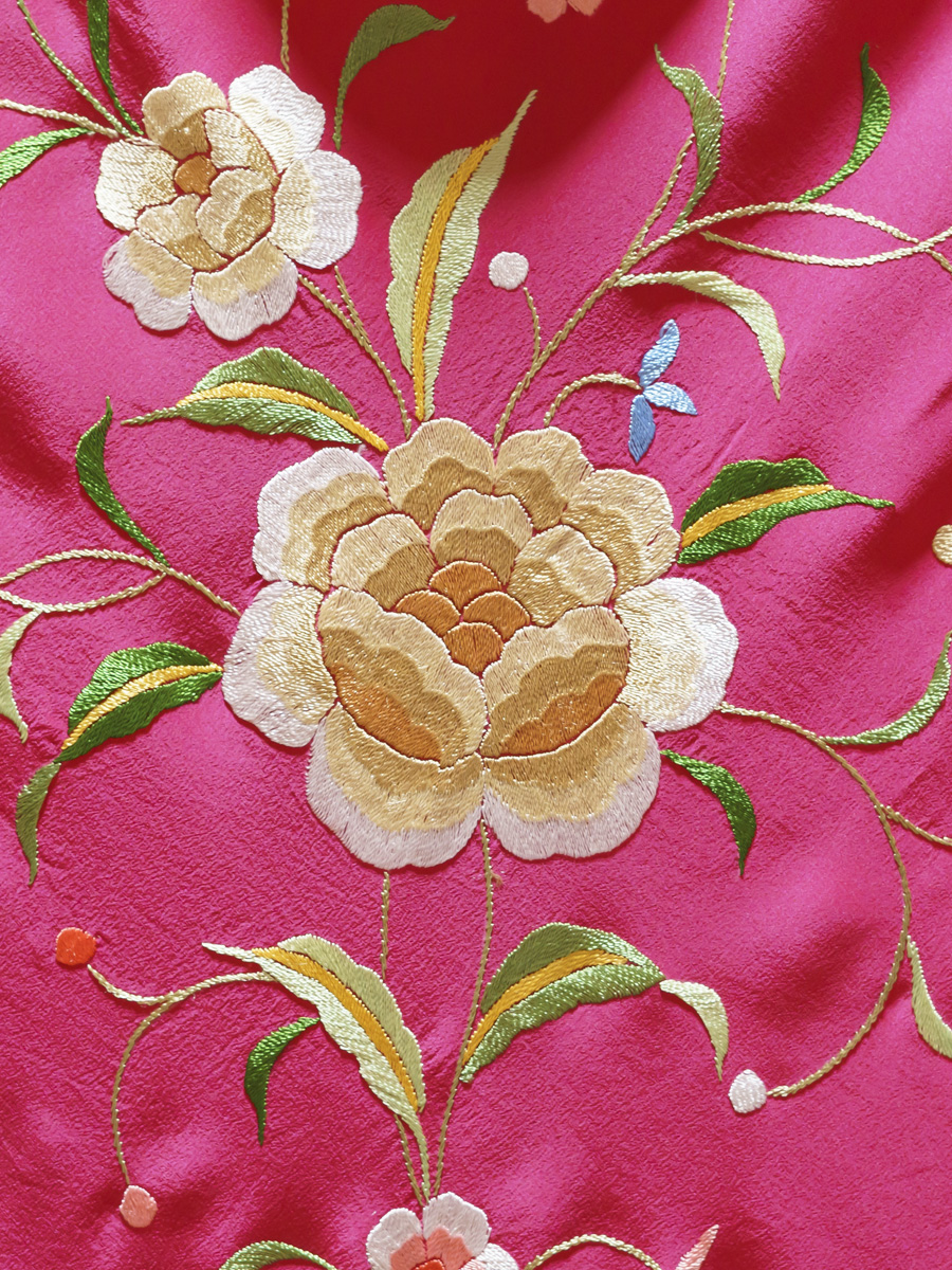 Nuestros bordados son ricos y coloridos, dominados como es tradicional por flores grandes y coloridas como rosas, peonías, claveles, y otras flores exóticas, pero también aves y otros animales, etc., especialmente en nuestros mantones más antiguos.
