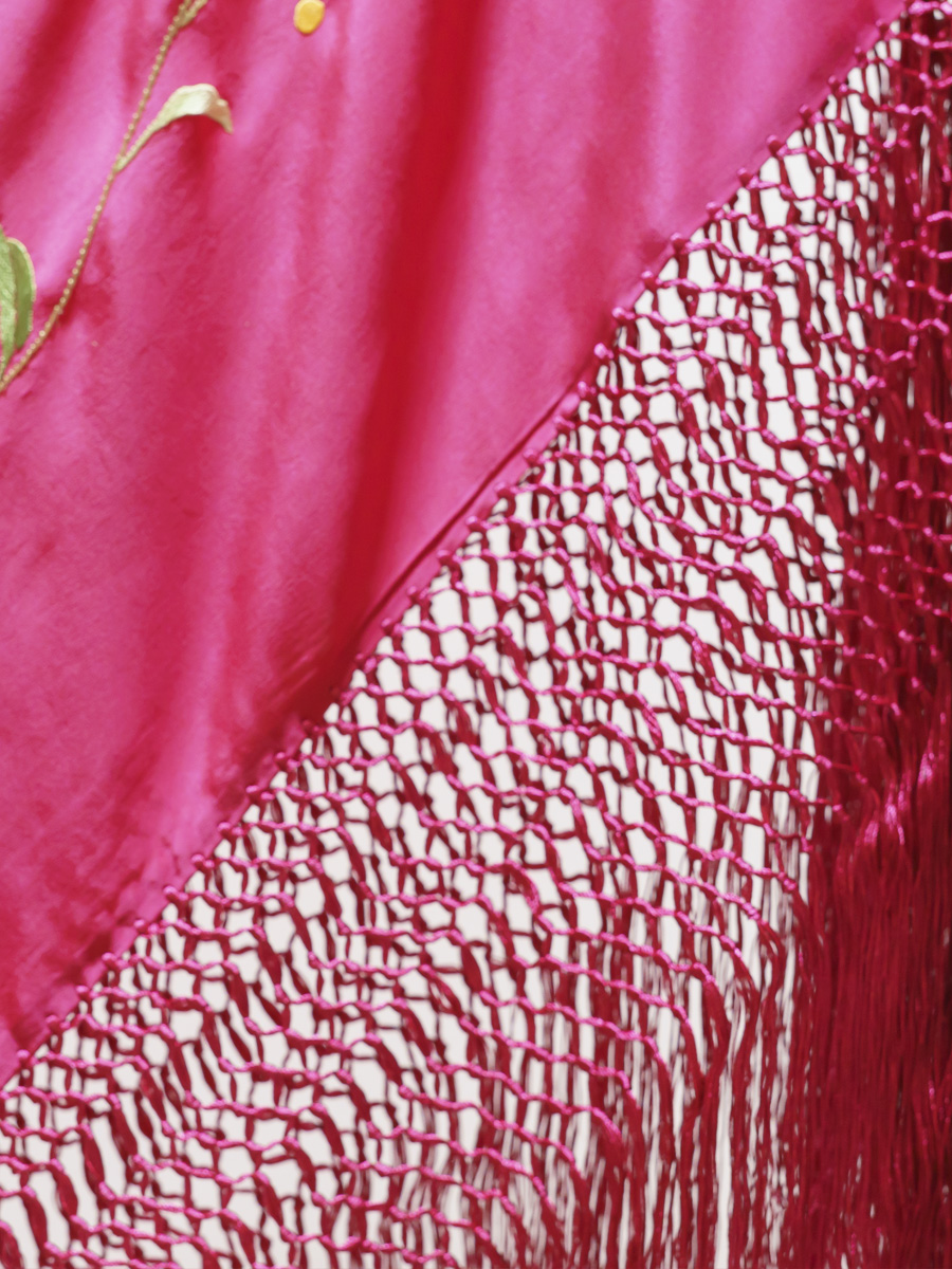 La mayoría de nuestros mantones de seda natural, un tejido suave, ligero y con un brillo natural, bordados y con flecos anudados a mano durante semanas o incluso meses como se hacía antes, por nuestros maestros artesanos de tercera generación.