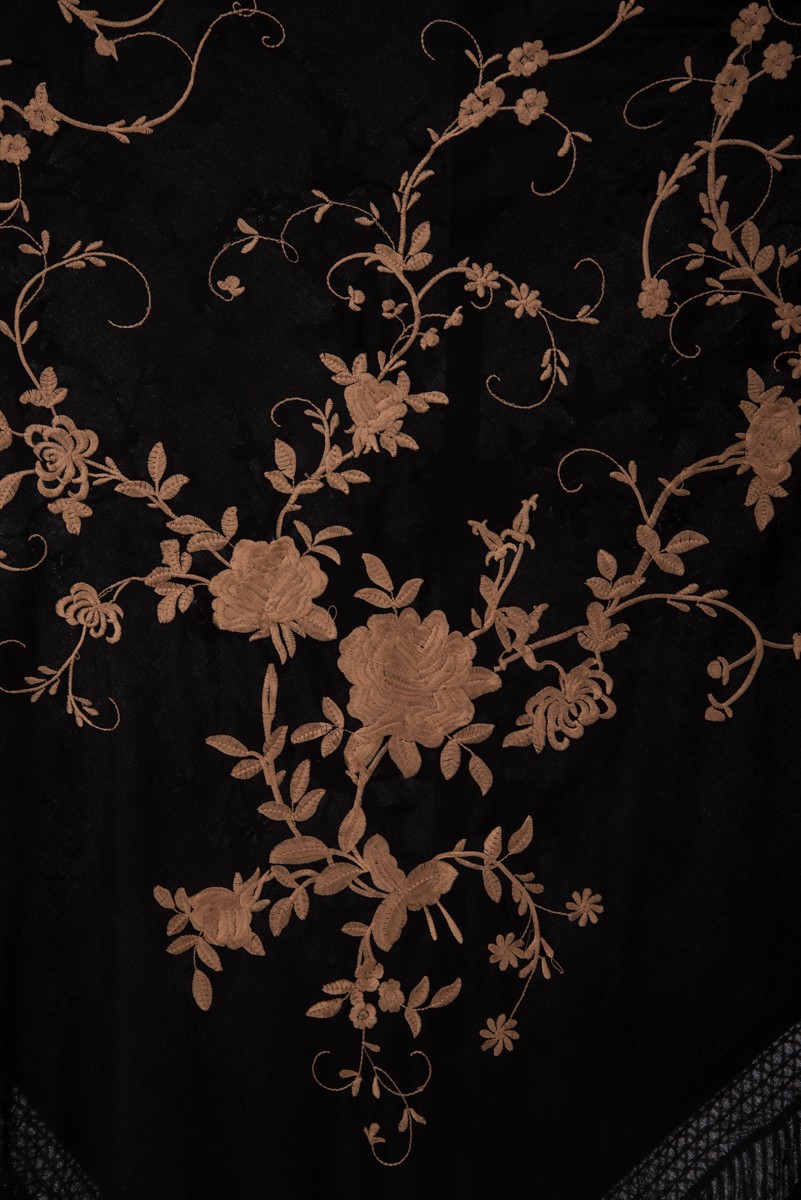 La mayoría de nuestros mantones de seda natural, un tejido suave, ligero y con un brillo natural, bordados y con flecos anudados a mano durante semanas o incluso meses como se hacía antes, por nuestros maestros artesanos de tercera generación.