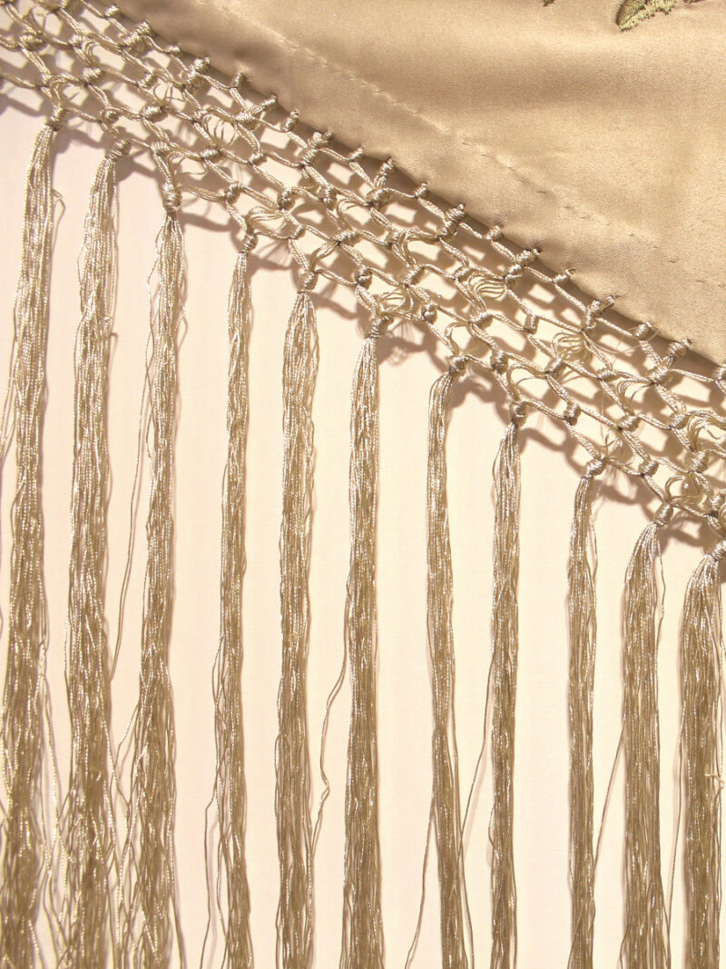 Mantoncillo bordado en crespón, con motivos florales y una flor de tauste en el centro. Fleco anudado a mano. En forma de pico, ideal para traje de flamenca.