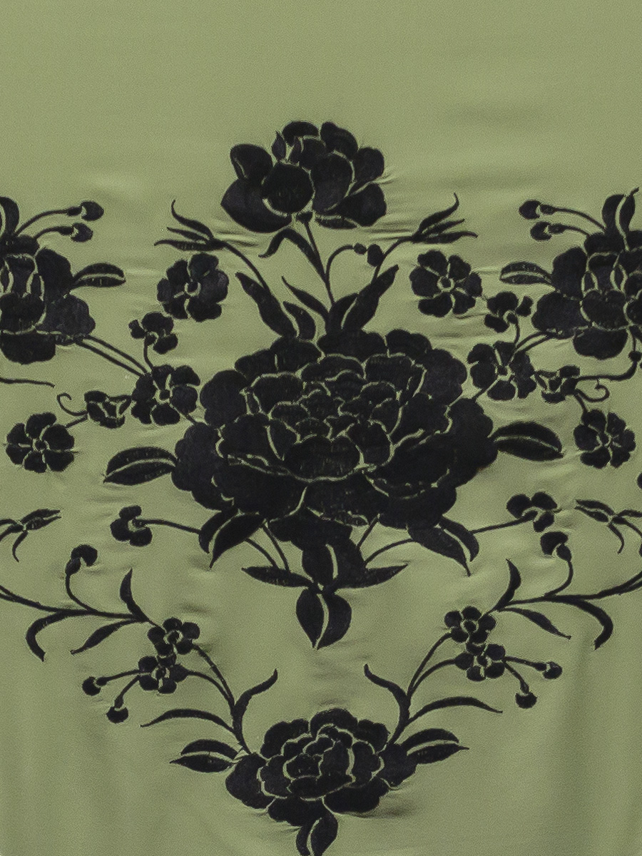 Nuestros bordados son ricos y coloridos, dominados como es tradicional por flores grandes y coloridas como rosas, peonías, claveles, y otras flores exóticas, pero también aves y otros animales, etc., especialmente en nuestros mantones más antiguos.