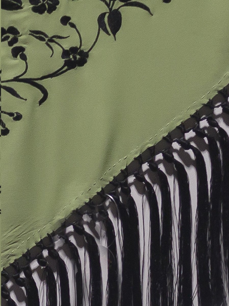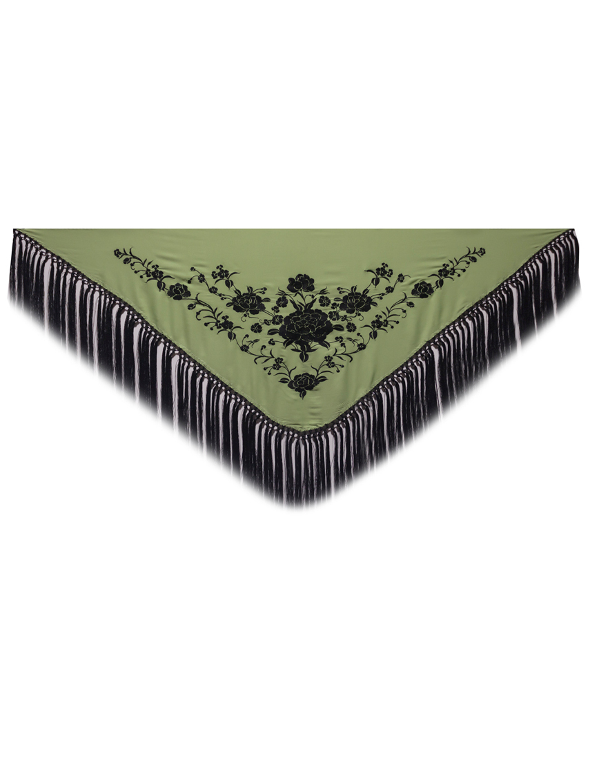 Mantoncillo bordado en crespón, con motivos florales de rosas bordadas en color negro. Fleco anudado a mano. En forma de pico, ideal para traje de flamenca.