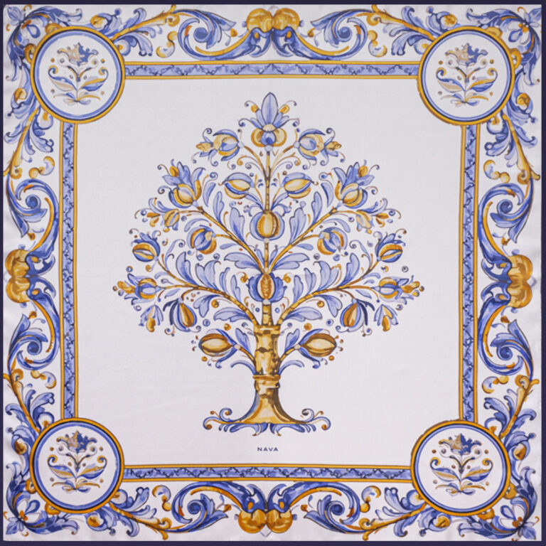 Pañuelo cuadrado de seda con estampado inspirado en la serie tricolor de la cerámica de Talavera. Se envía en caja regalo.