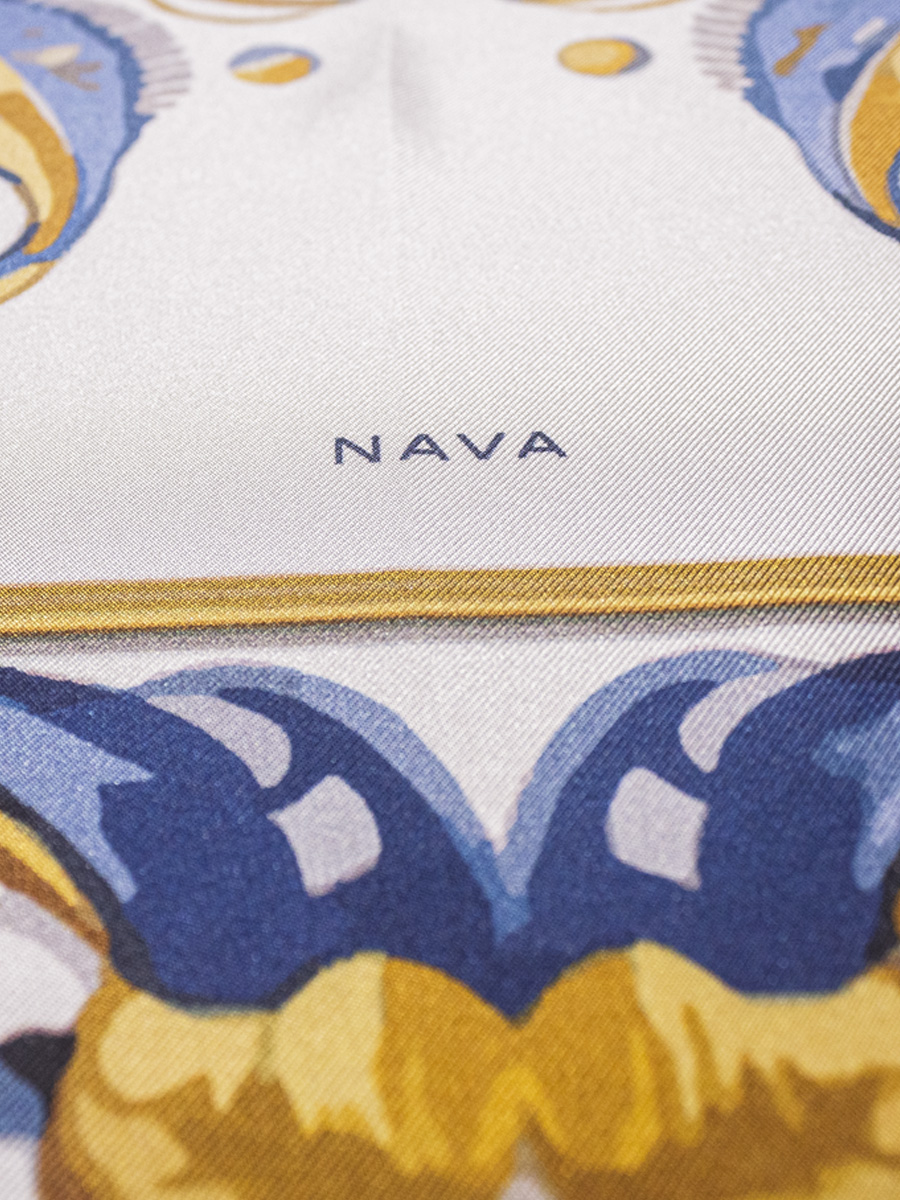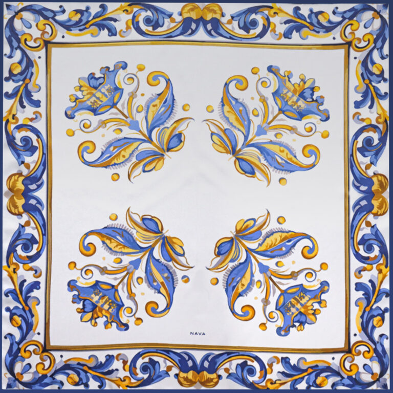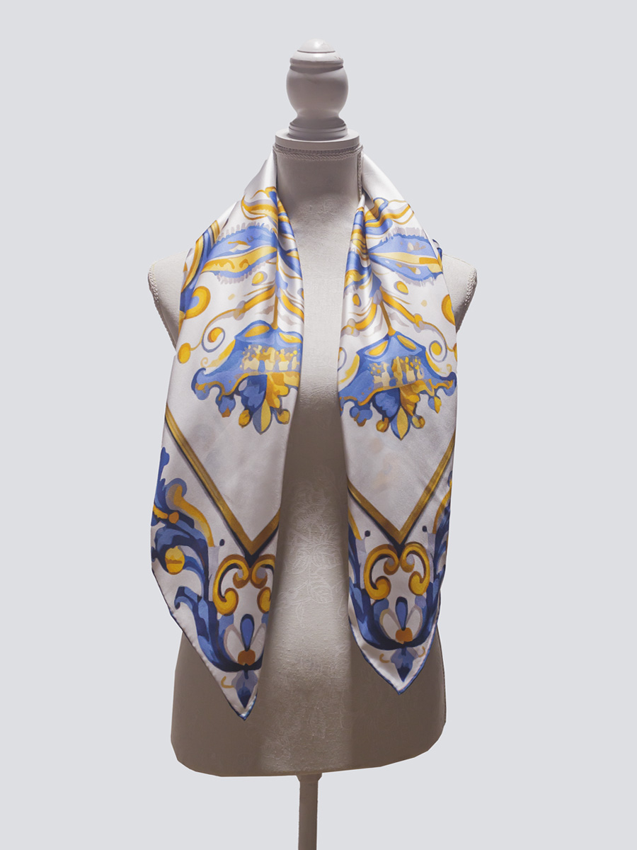 Pañuelo cuadrado de seda con estampado inspirado en la serie tricolor de la cerámica de Talavera. Se envía en caja regalo.