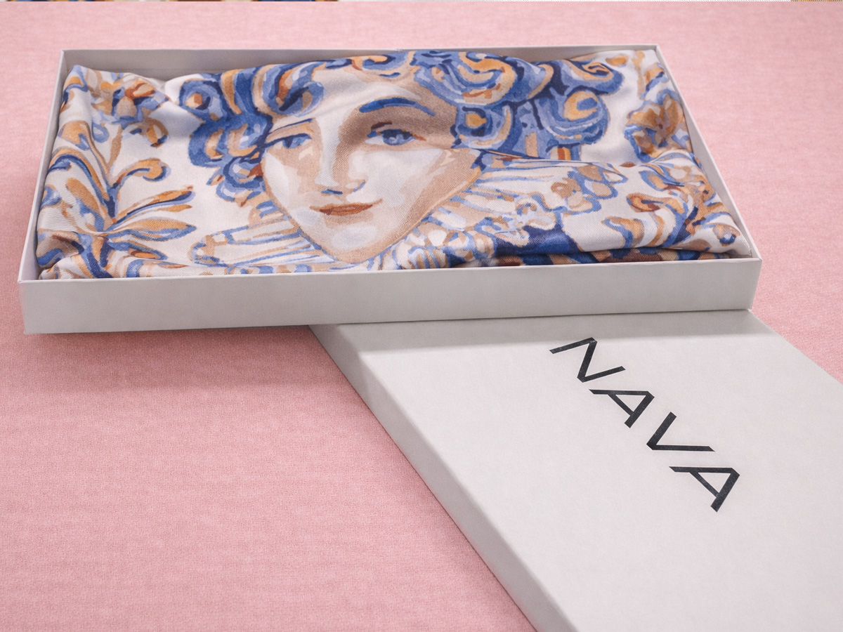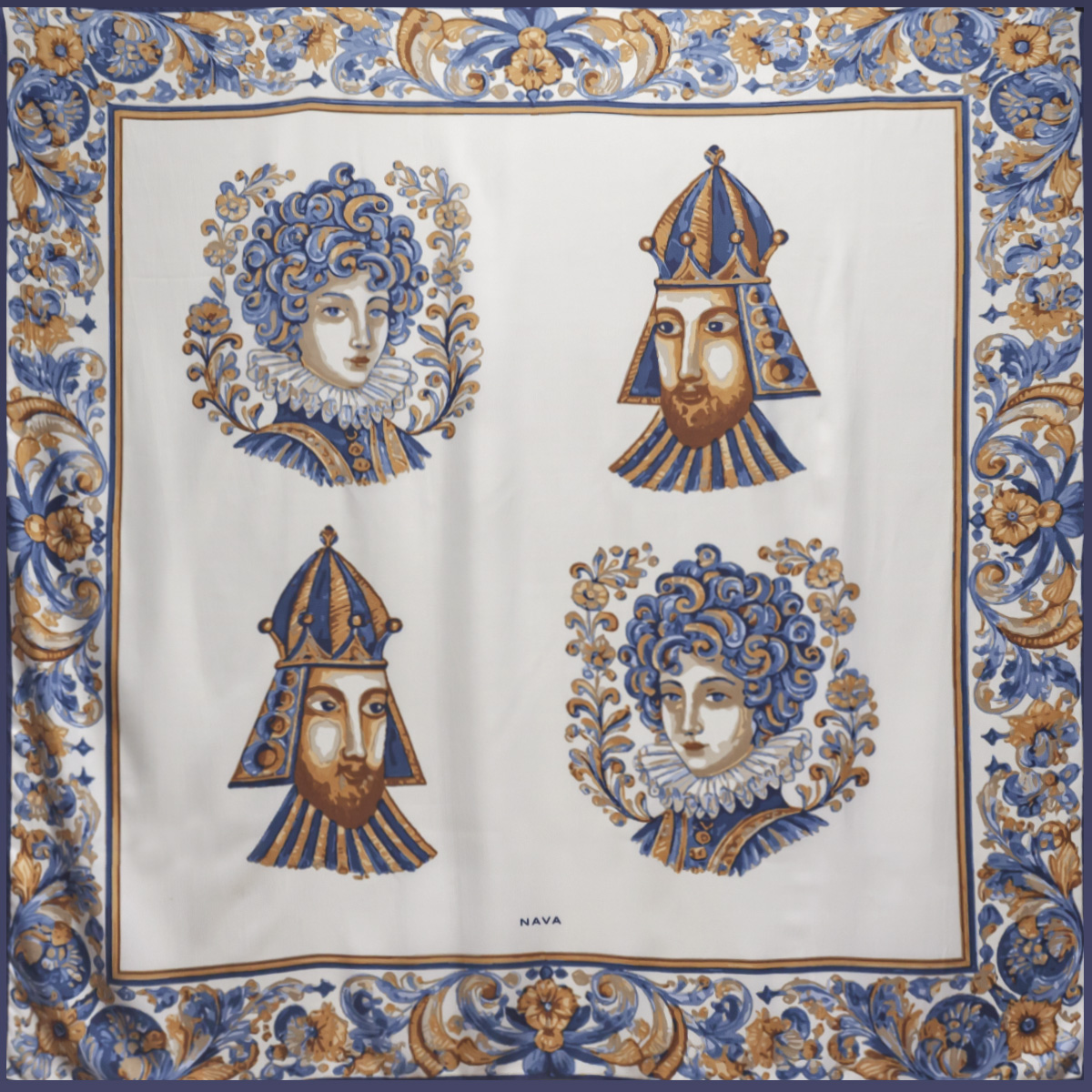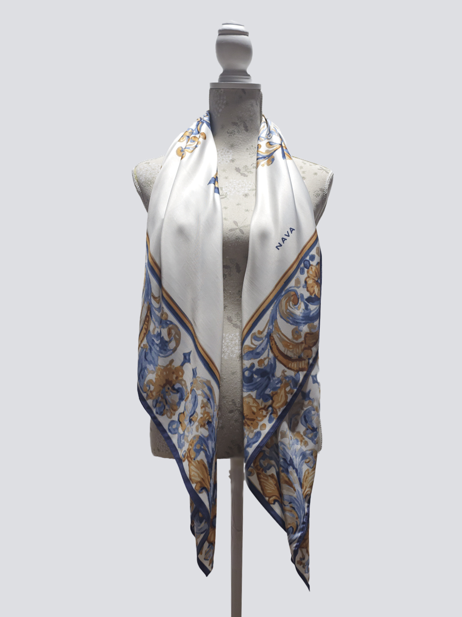 Pañuelo cuadrado de tacto seda con estampado inspirado en la cerámica de Talavera.